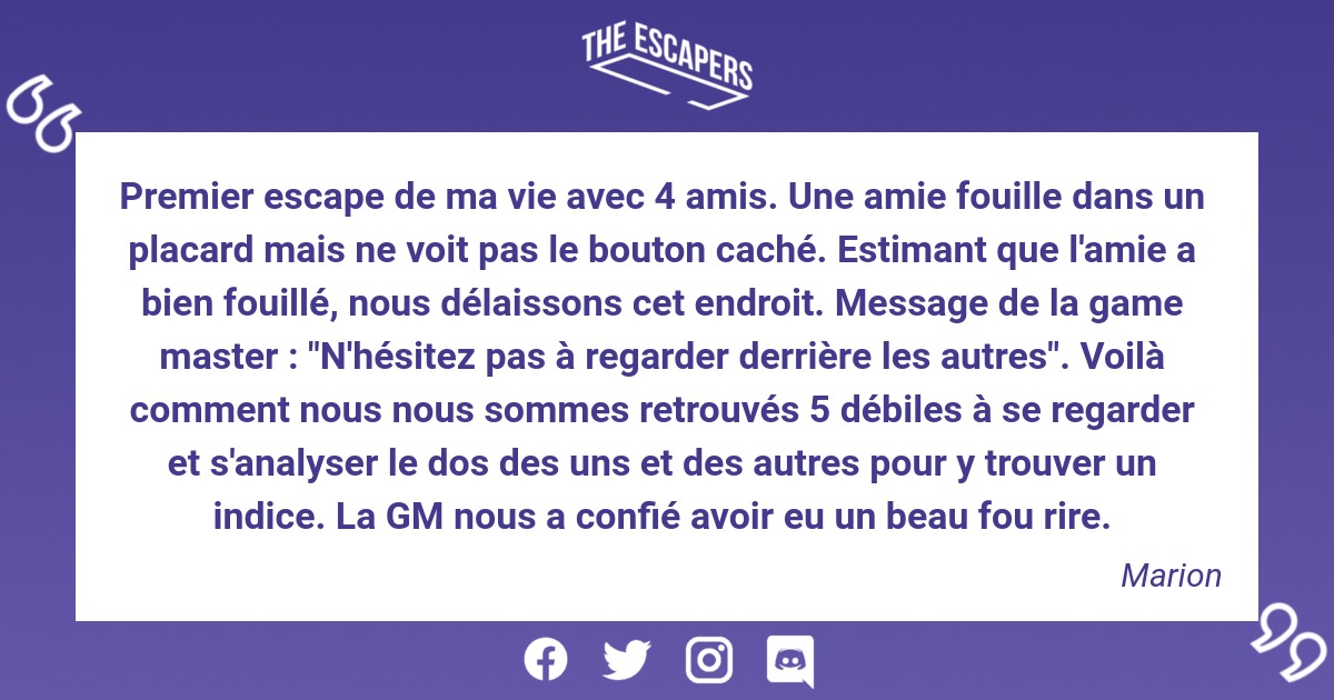 Premier escape de ma vie avec 4 amis. Une amie fouille dans un placard mais ne voit pas le bouton caché. Estimant que l'amie a bien fouillé, nous délaissons cet endroit. Message de la game master : "N'hésitez pas à regarder derrière les autres". Voilà comment nous nous sommes retrouvés 5 débiles à se regarder et s'analyser le dos des uns et des autres pour y trouver un indice. La GM nous a confié avoir eu un beau fou rire.