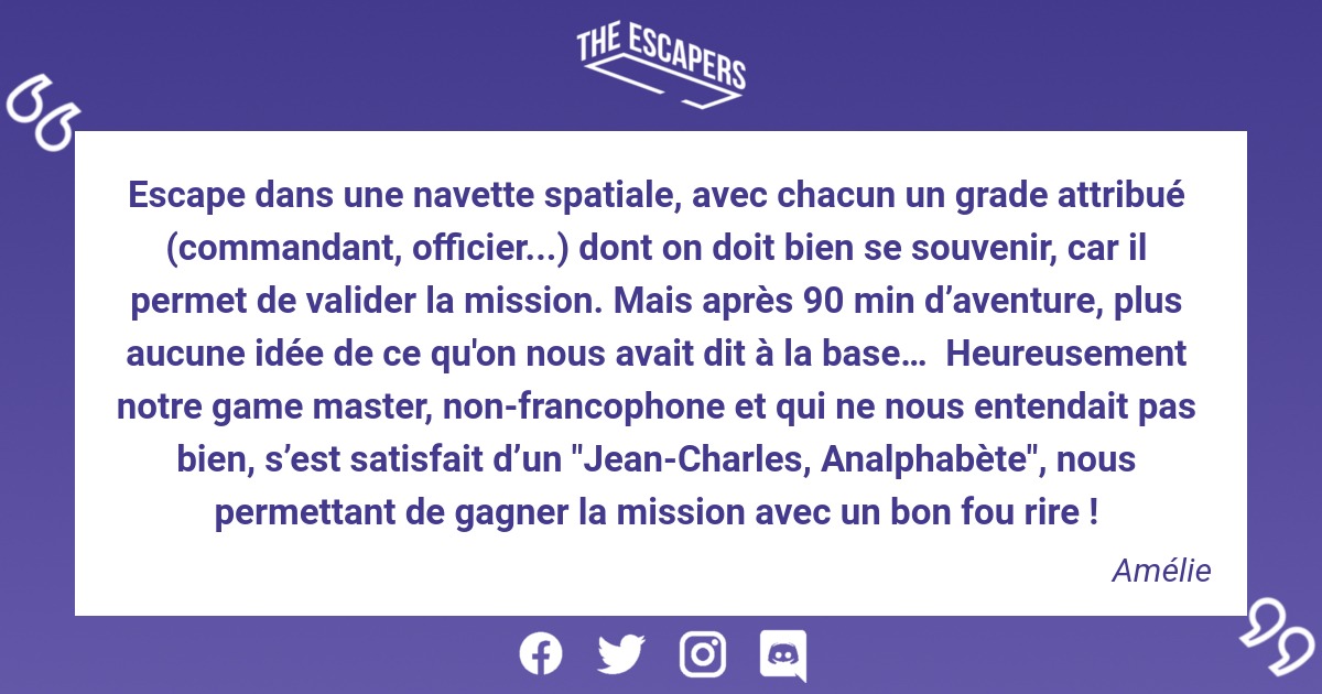 Escape dans une navette spatiale, avec chacun un grade attribué (commandant, officier...) dont on doit bien se souvenir, car il permet de valider la mission. Mais après 90 min d’aventure, plus aucune idée de ce qu'on nous avait dit à la base… Heureusement notre game master, non-francophone et qui ne nous entendait pas bien, s’est satisfait d’un "Jean-Charles, Analphabète", nous permettant de gagner la mission avec un bon fou rire !